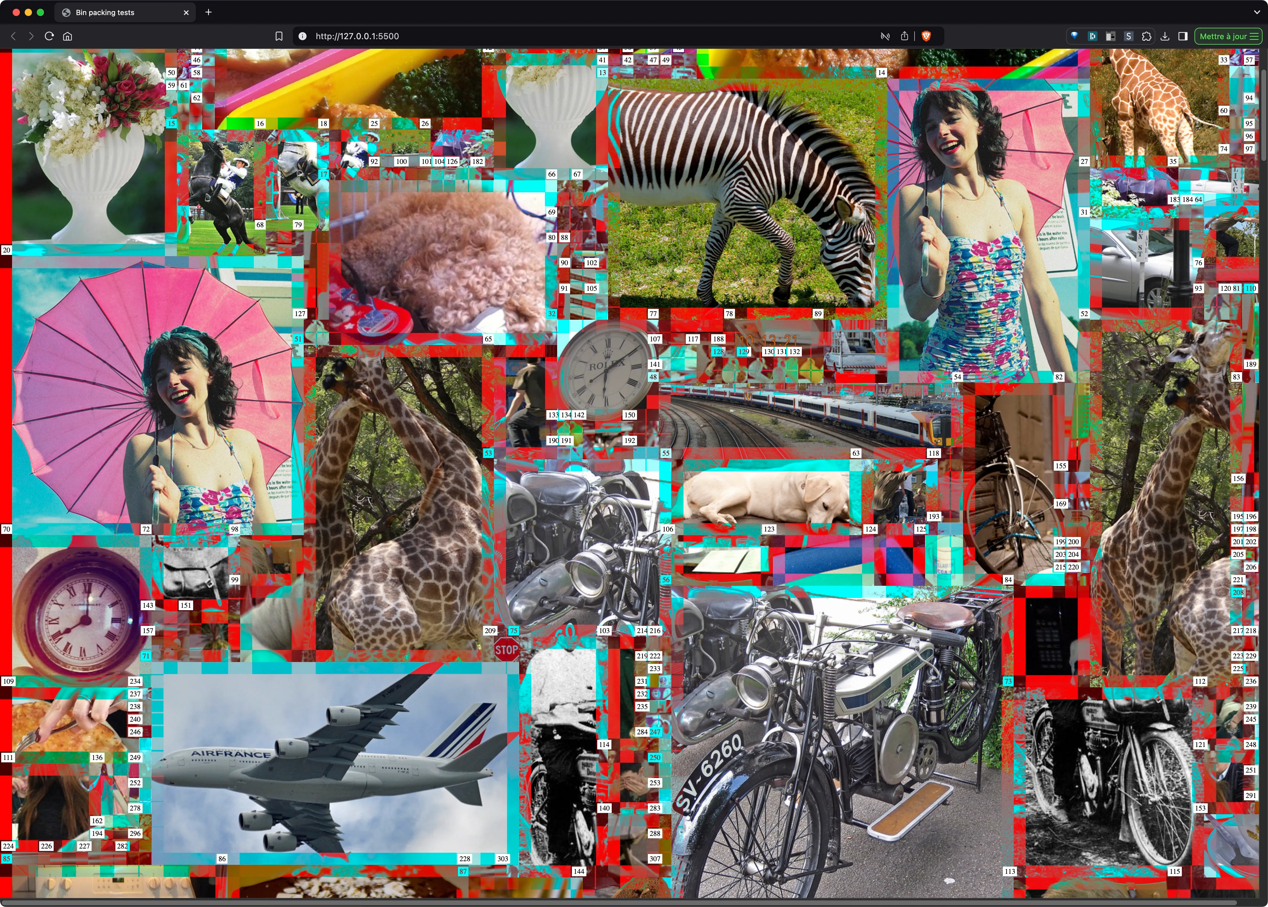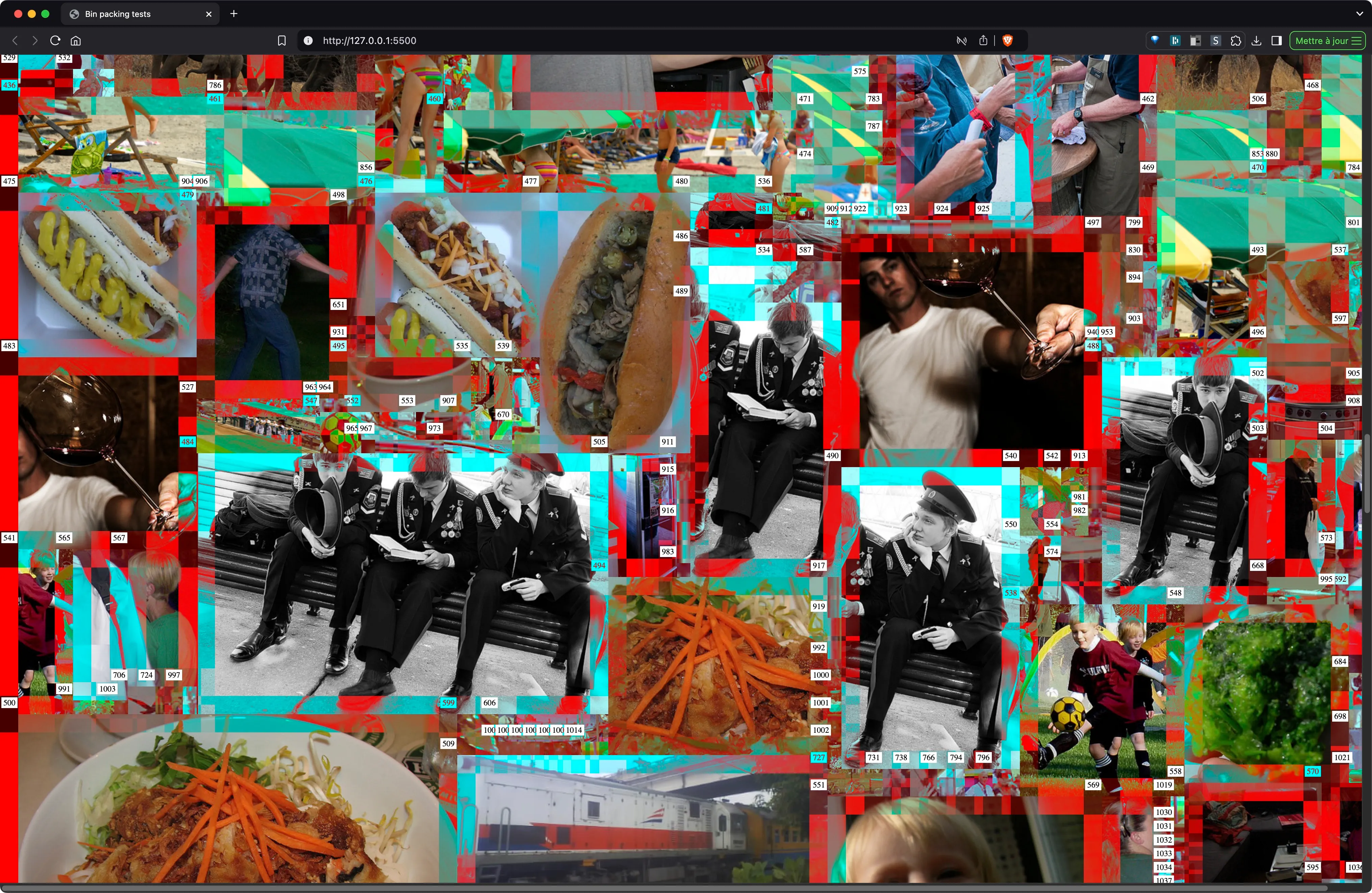Ce projet s'intéresse à la façon dont les algorithmes optimisent l'occupation de l'espace (notamment pour le stockage et le transport d'objets ou de données). Il rend aussi visible des images qui restent général cachées et ne servent qu'à entrainer des modèle de reconnaissance et d'analyse d'images. Ce faisant, il rend aussi visible d'une certaine manière les biais de certains jeux de données.