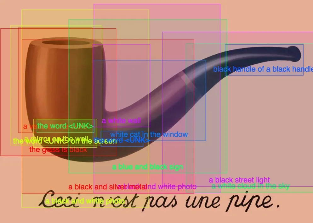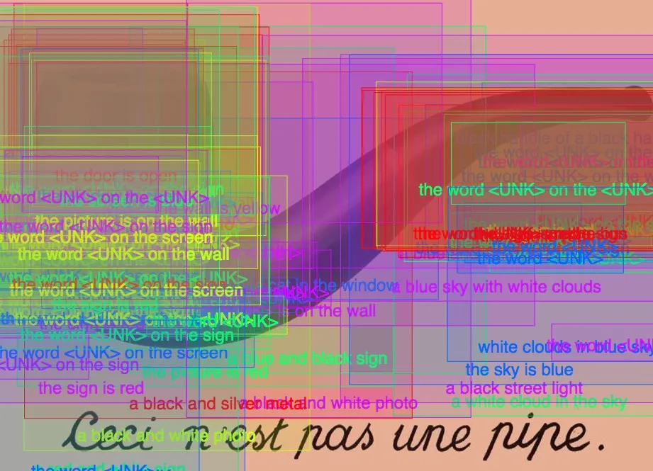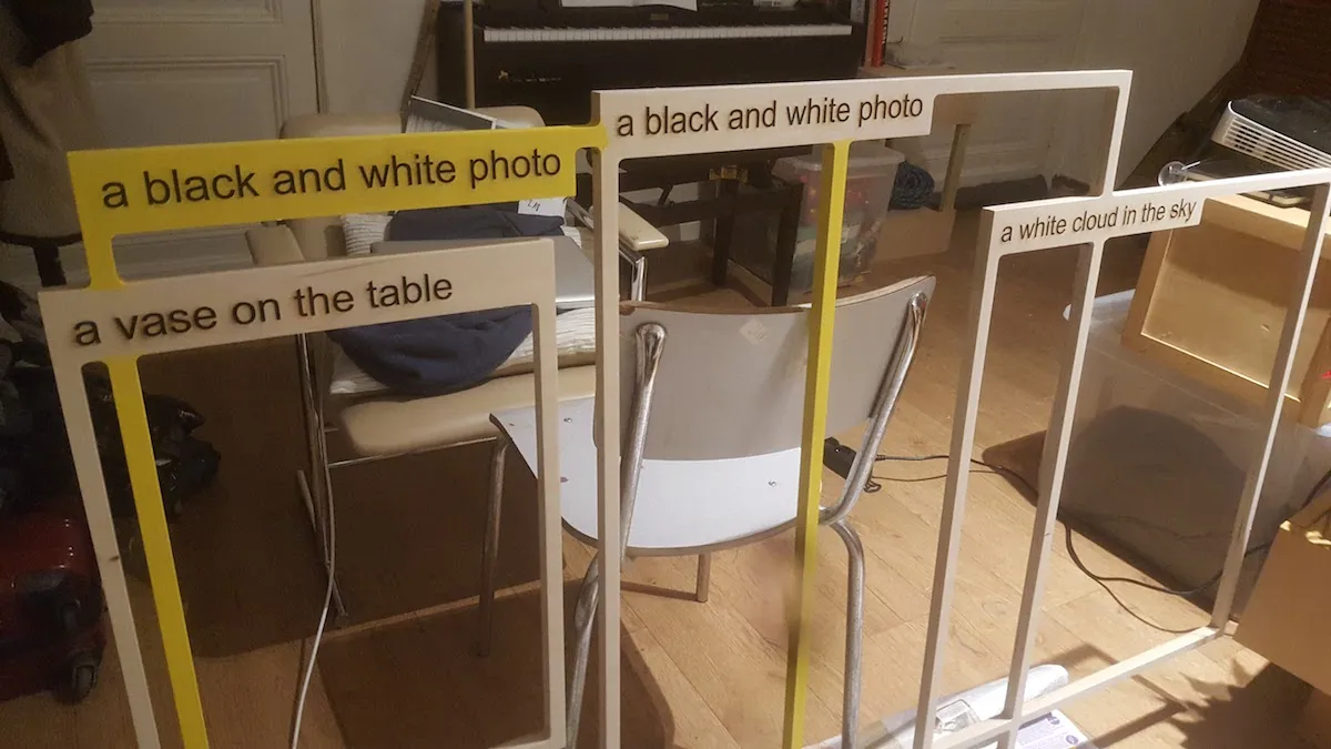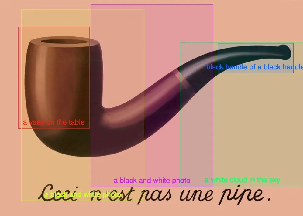 Ceci n'est pas une pipe (Détail, 2017). Découpe CNC, gravure laser, peinture acrylique. Cet objet reprend les différentes boîtes englobantes des objets détectés par un algorithme imparfait dans le tableau de René Magritte. (voir galerie ci-dessous)Ce corpus de projets ou travaux est lié au projet Delocalized Narratives dont il constitue à la fois les prémisces (détéction, suppression), et une forme d'aboutissement (accumulation).