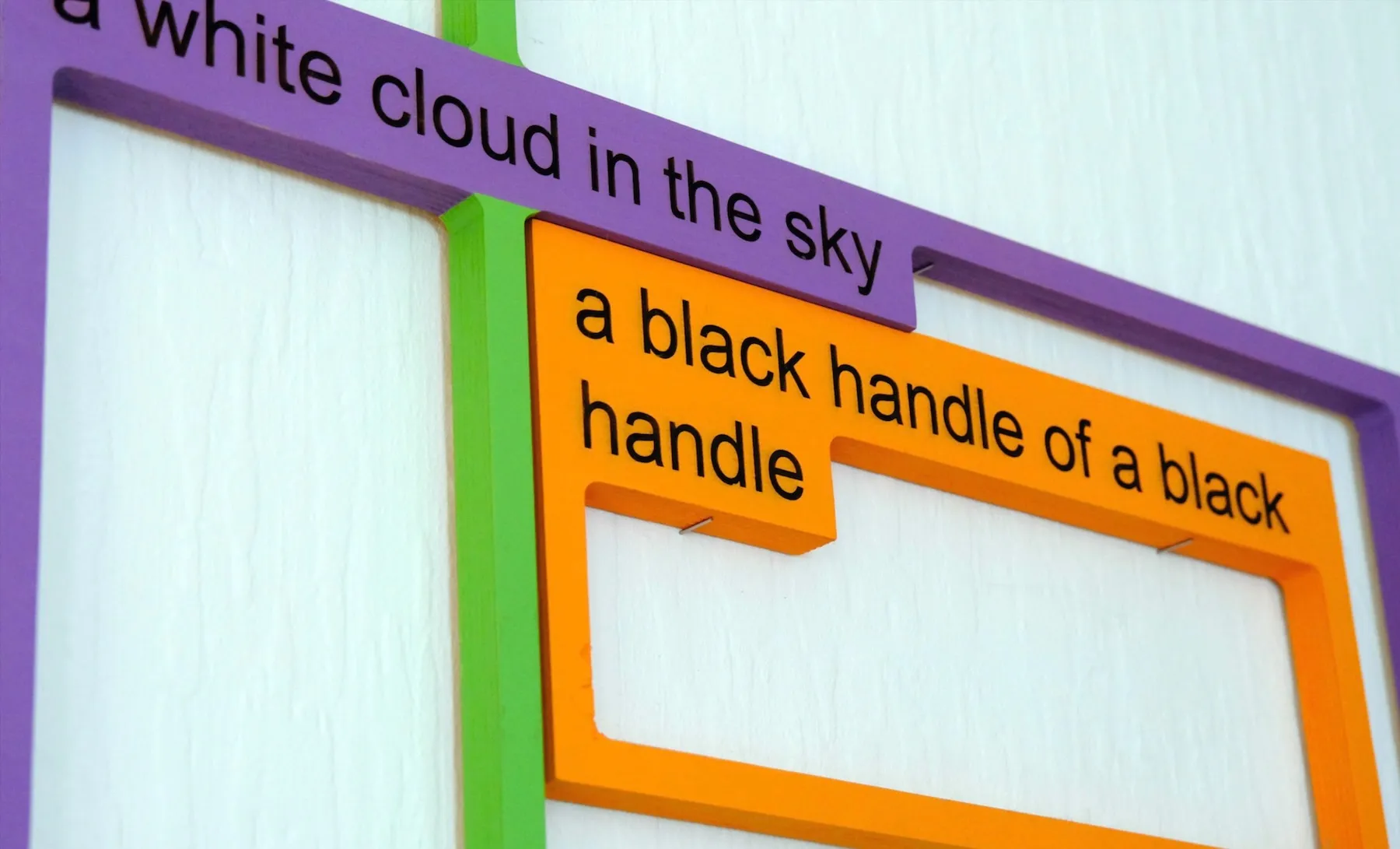 Ceci n'est pas une pipe (Détail, 2017). Découpe CNC, gravure laser, peinture acrylique. Cet objet reprend les différentes boîtes englobantes des objets détectés par un algorithme imparfait dans le tableau de René Magritte. (voir galerie ci-dessous)Ce corpus de projets ou travaux est lié au projet Delocalized Narratives dont il constitue à la fois les prémisces (détéction, suppression), et une forme d'aboutissement (accumulation).