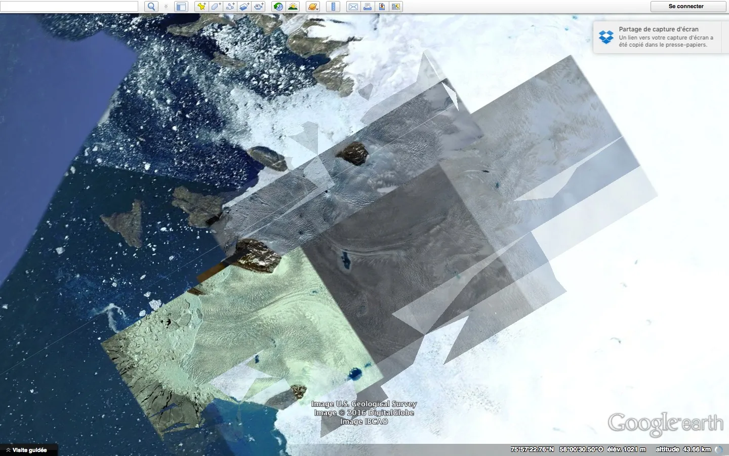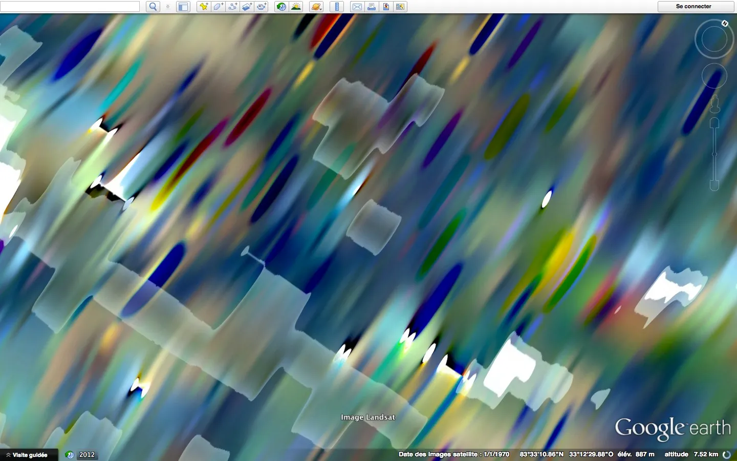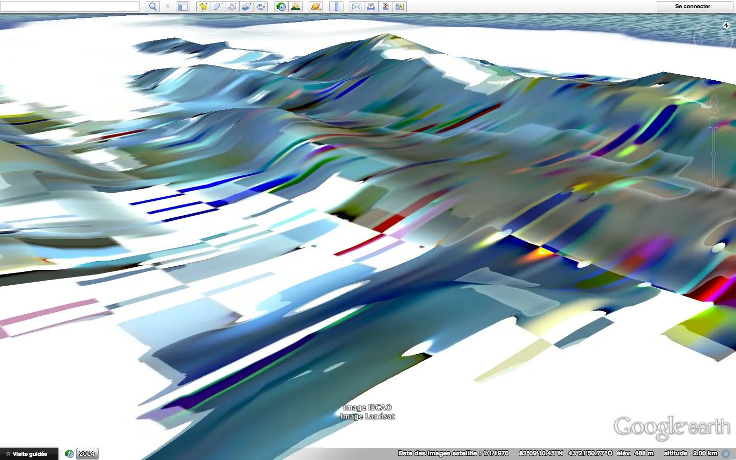 Capture d'écran du siteMicroclimats est une longue série d’écrans capturés lors d’une exploration systématique des côtes du Groenland (principalement). Elle rend visible la juxtaposition d’images satellites dans des temporalités et conditions parfois très différentes. La variation de l’élévation créait, au chargement de nouvelles images, une série d’artefacts intéressants rendant parfois les images très dynamiques.