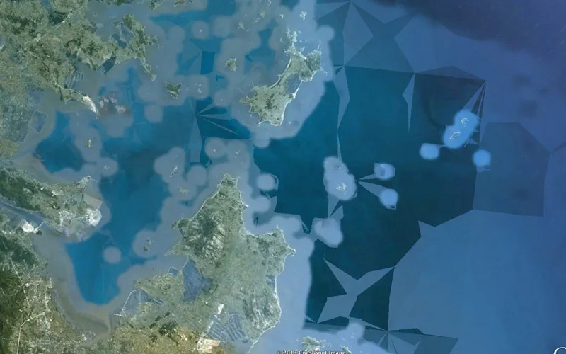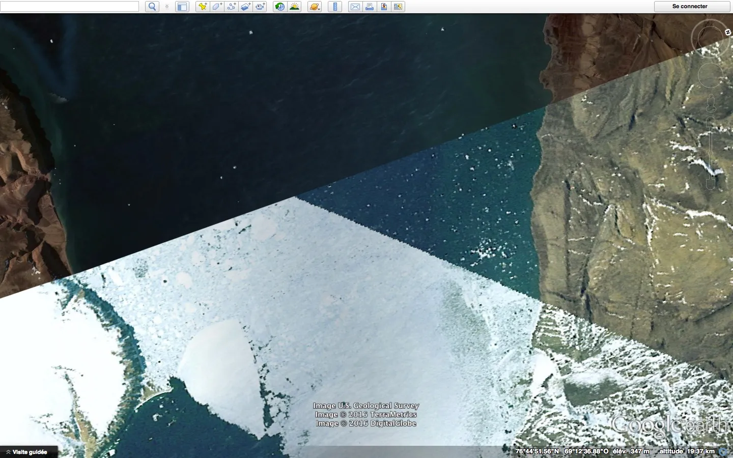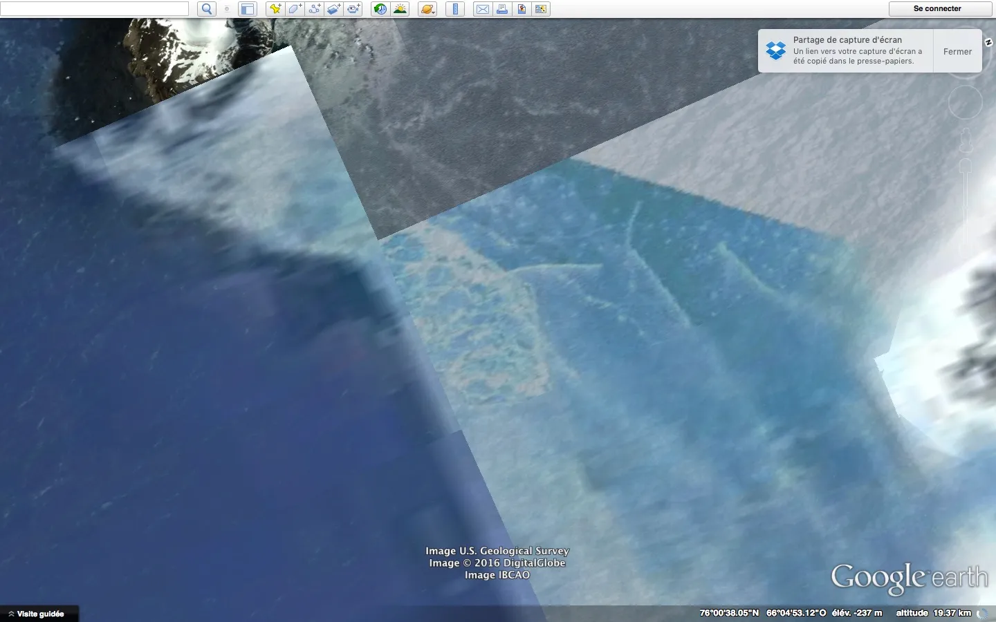Capture d'écran du siteMicroclimats est une longue série d’écrans capturés lors d’une exploration systématique des côtes du Groenland (principalement). Elle rend visible la juxtaposition d’images satellites dans des temporalités et conditions parfois très différentes. La variation de l’élévation créait, au chargement de nouvelles images, une série d’artefacts intéressants rendant parfois les images très dynamiques.