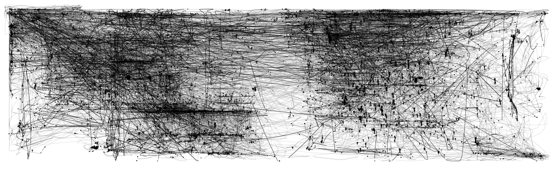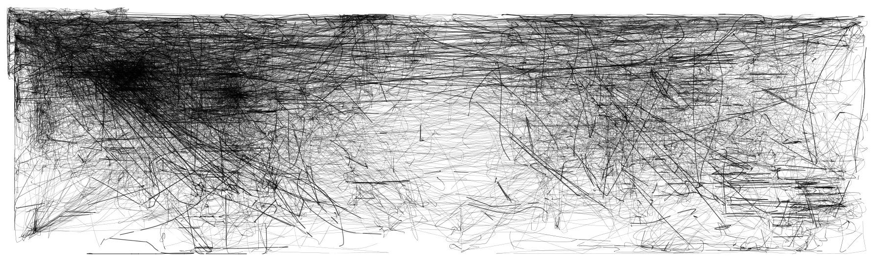 La trace graphique de ce travail évoque aussi toute cette filiation du dessin délégué, aux oiseaux, aux vibrations d’un train, ou aux mouvements de nos yeux.