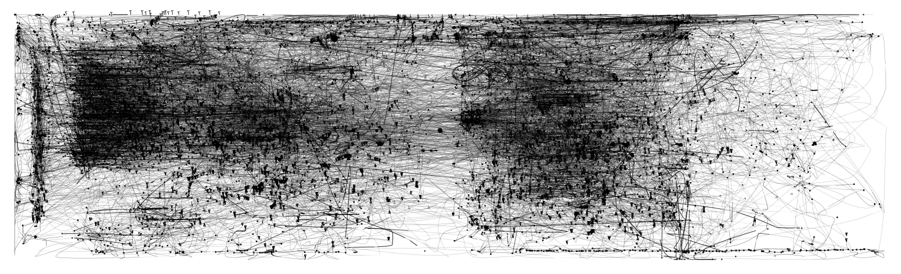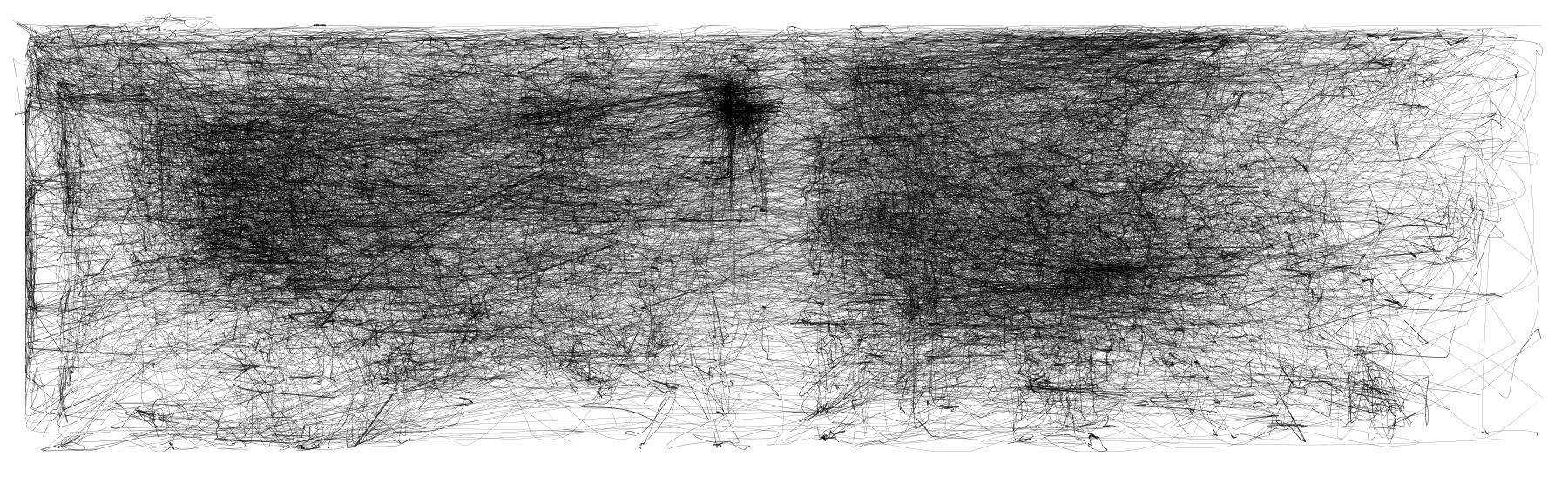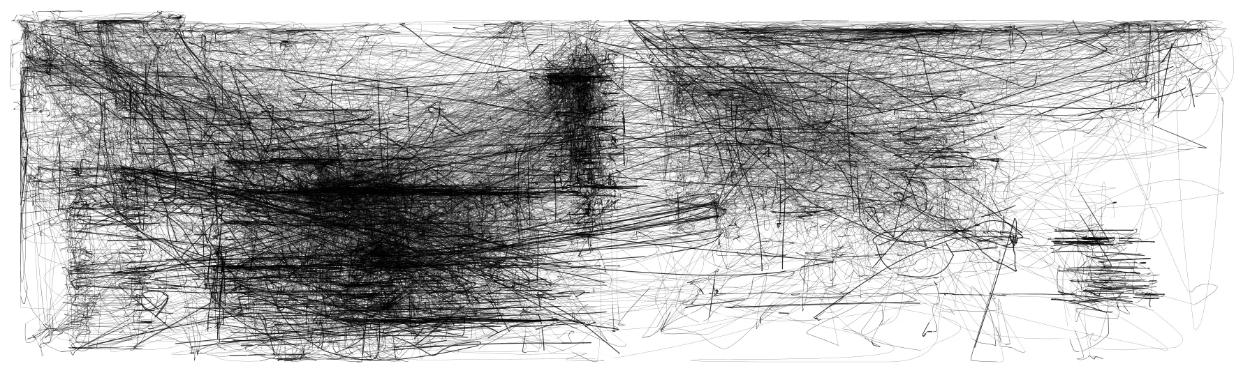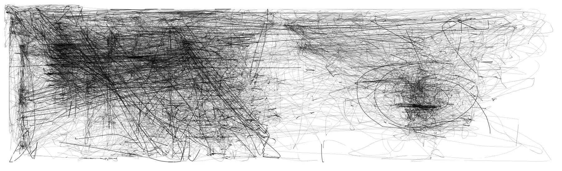 19 octobre 2025 – Déplacements: 997.05 km / Glissements: 50.01 m / Défilements: 30.38 m / Clics: 7390Work, work, work (2018-2025) est un catalogue du travail effectué jour après jour, archivant les mouvements et actions effectués par la souris (nombre de clics, km parcourus, drag/drop, scroll, et autres clics droits..) en mettant en évidence l'accumulation de ces micro-actions dans le temps.
