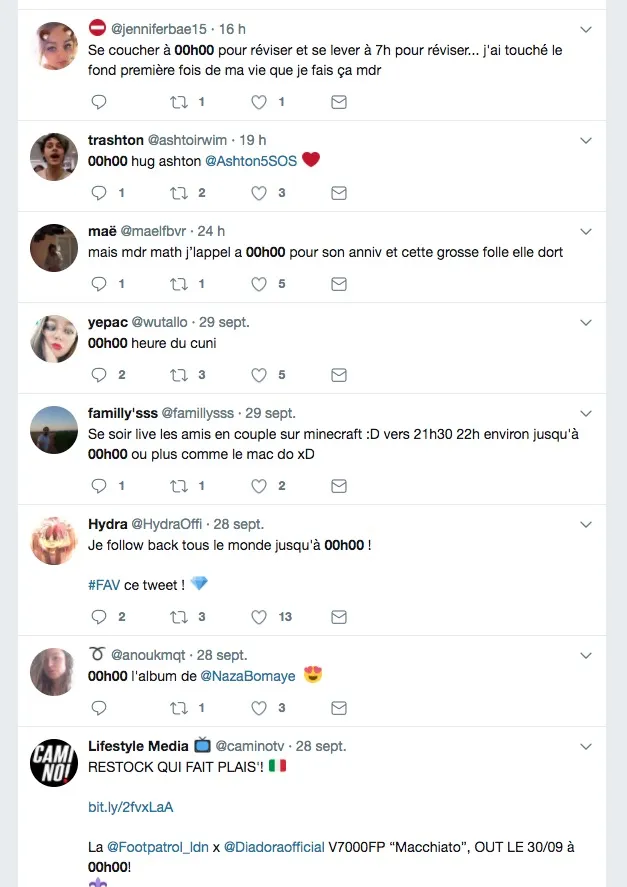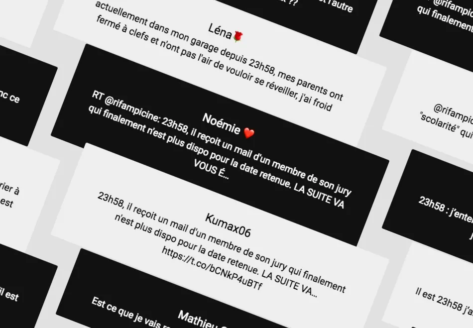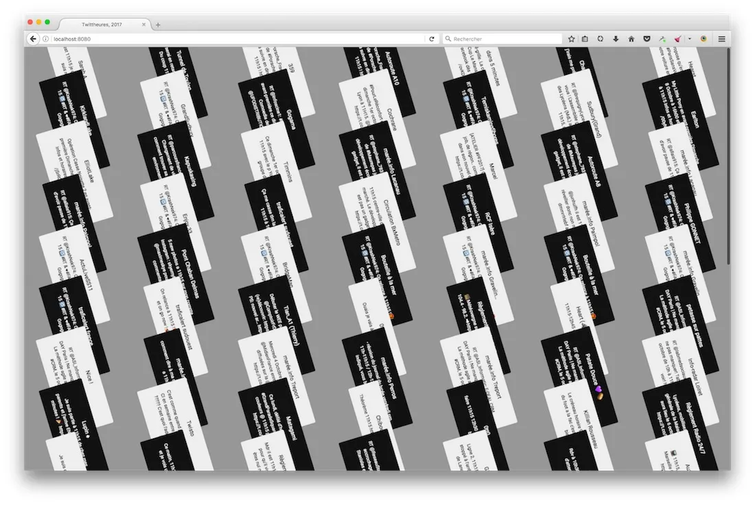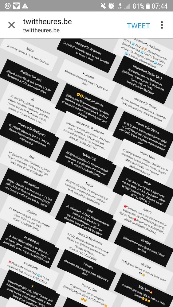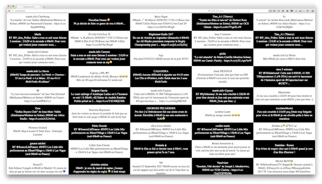Ce travail datant de 2018 utilisait l'API du regretté Twitter pour récupérer les messages qui mentionnaient explicitement l'heure qu'il était et les affichait dans une page web qui les mettait en rotation (60 secondes). Les messages étaient rechargés à chaque changement de minute.