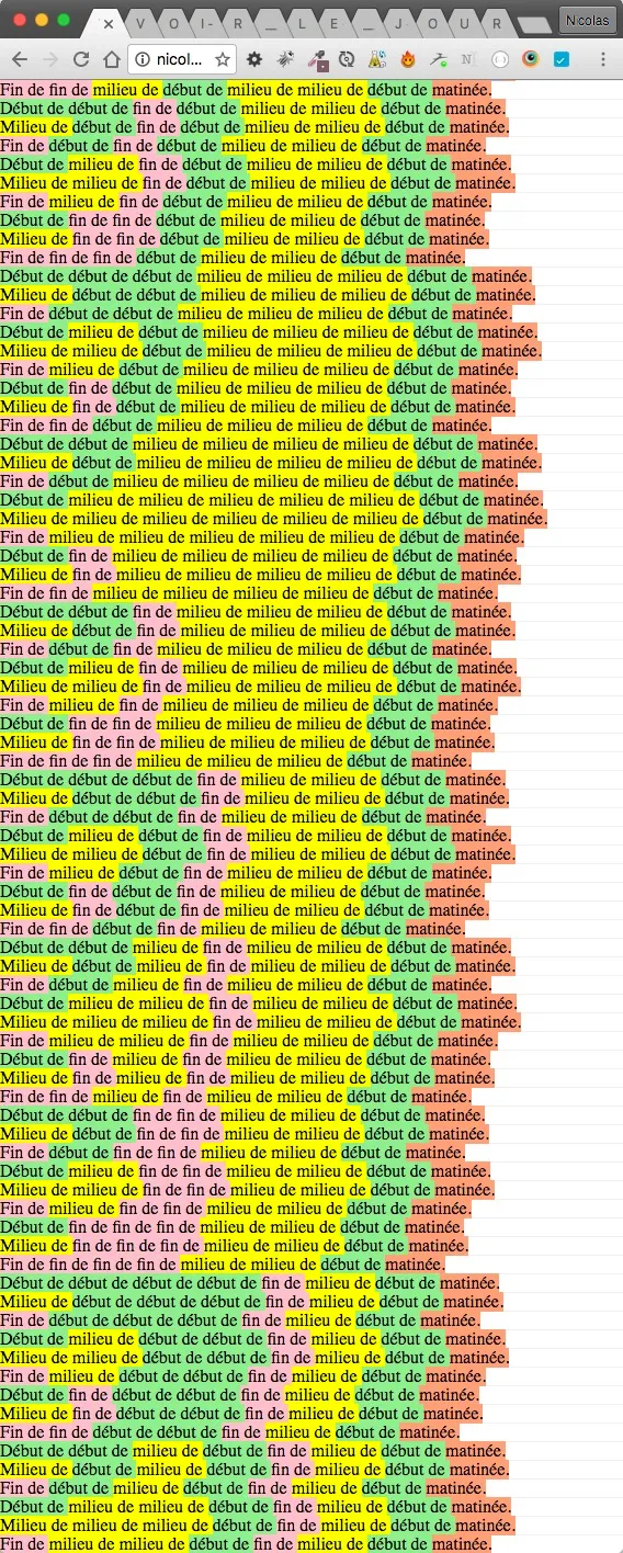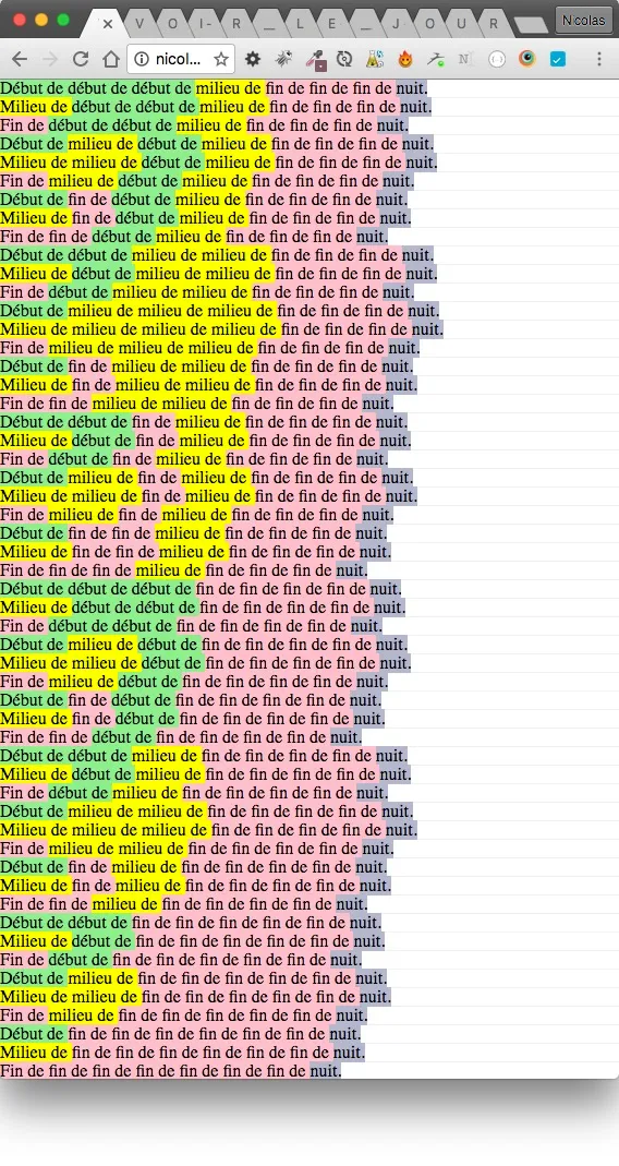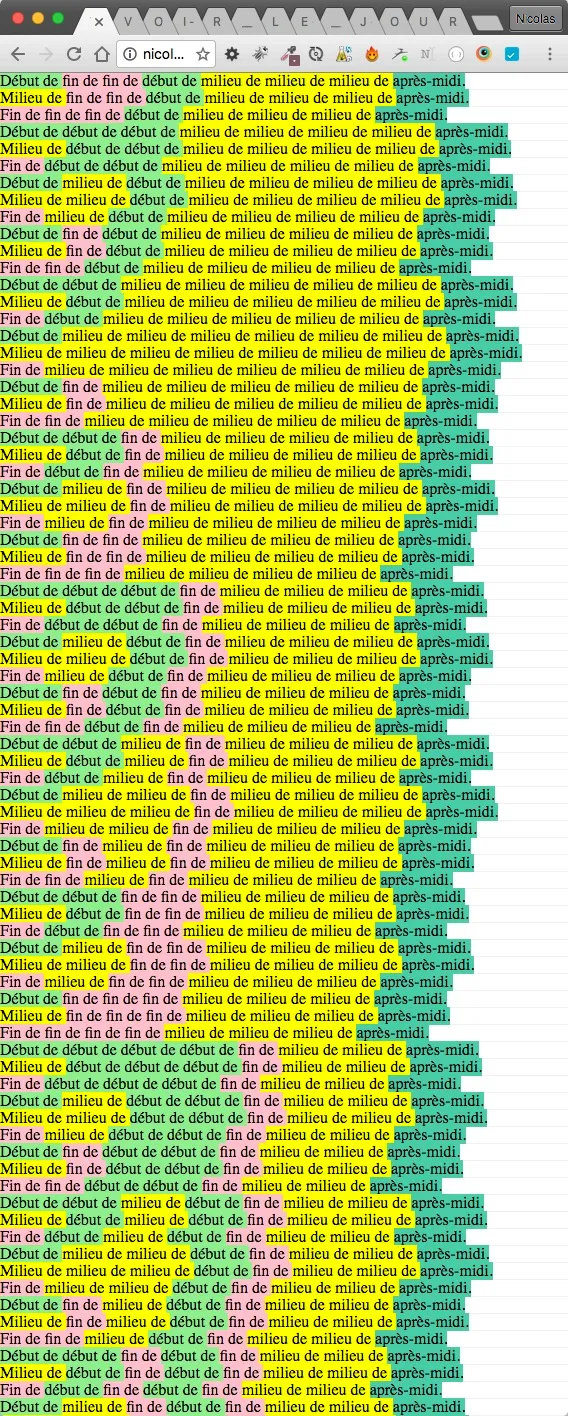 Voir le jour est un mémorial listant chaque instant d’une journée active (entre le début de matinée, et la fin de soirée) par rapport aux moments qui le suivent et le précèdent. Ce laps de temps se décompose en quelque 6561 moments (du type : «Début de fin de fin de milieu de début de début de milieu d’après-midi.»).